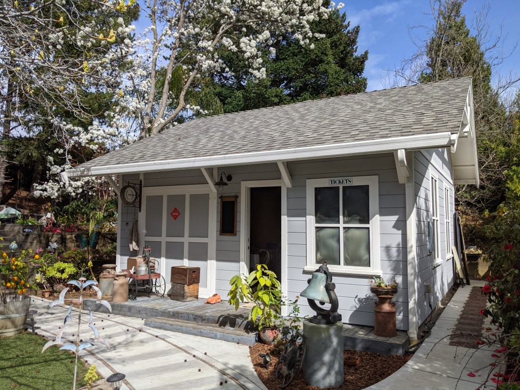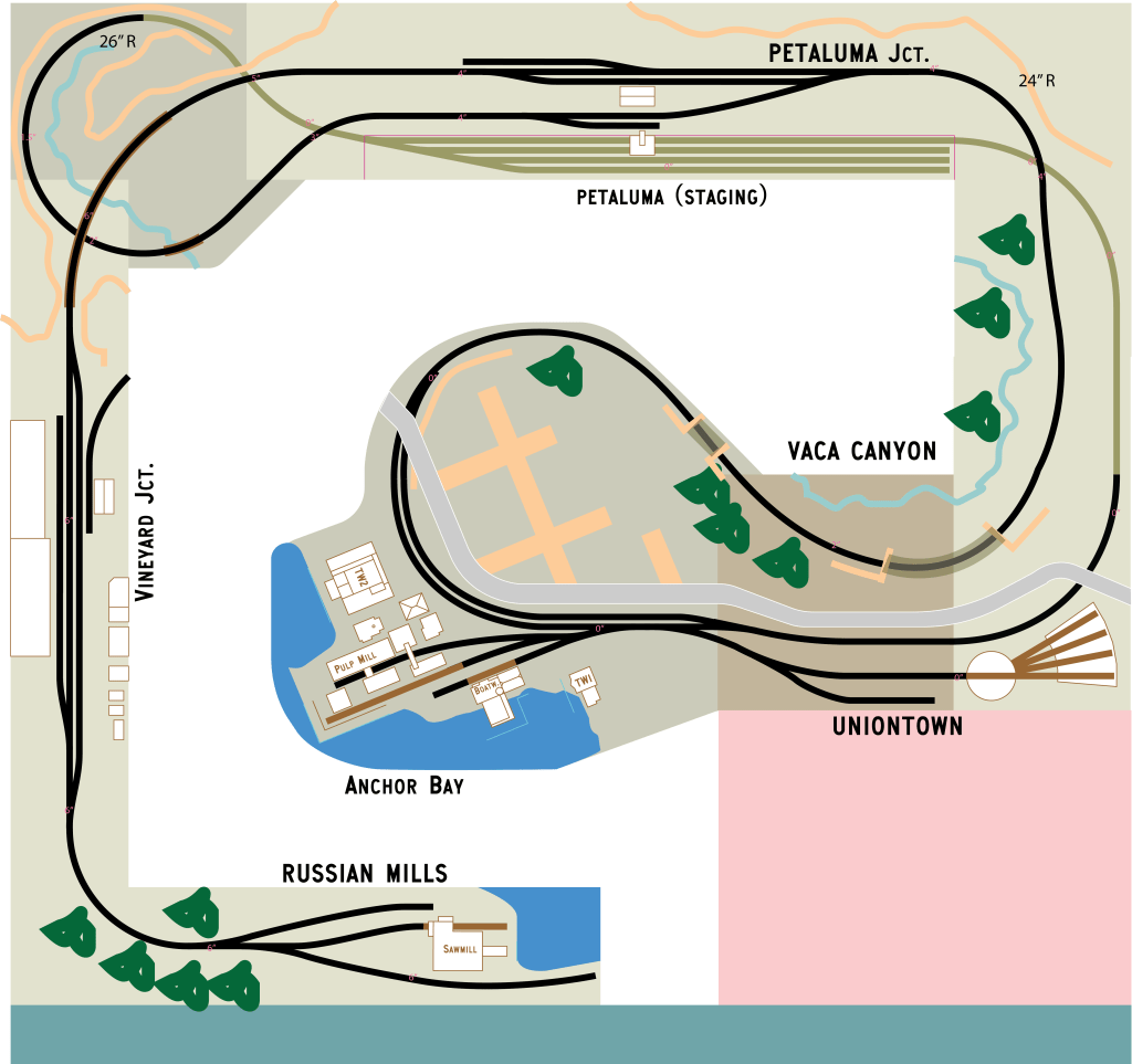 A 19×17′ layout inside its own custom railroad depot outbuilding capturing the beautiful “Redwood Empire” north of San Francisco Bay in the late 1940s. Heavily inspired by the Northwestern Pacific (NWP), California Western, Petaluma & Santa Rosa, and other California shortlines, the Anchor Bay Railway connects a sparkling harbor town with the SP in the Central Valley.