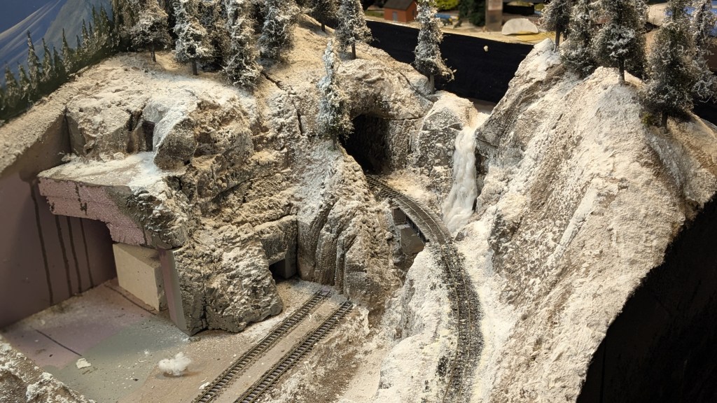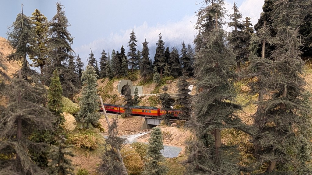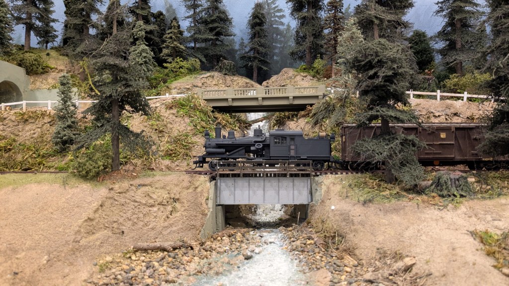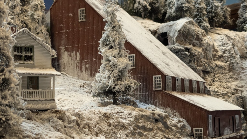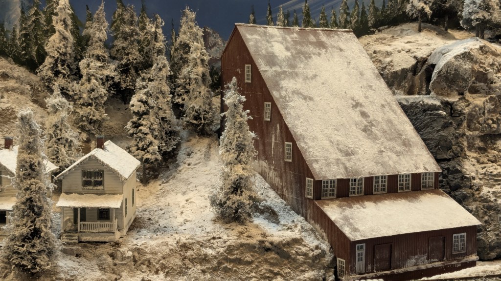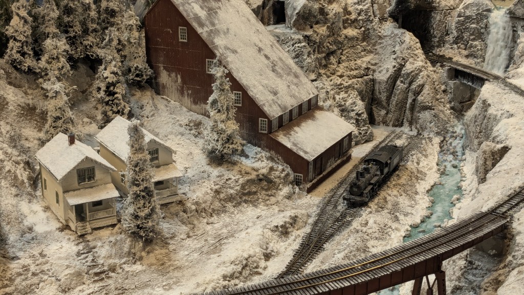 The scenery is directly inspired by places in Colorado, and then designed to fit each module. A dramatic river canyon with a waterfall flows past a massive stamp mill in late winter “mud season” in one module, while another captures a 30″ gauge logging operation in fall. Both spring and summer are captured on the center modules, one of which is a junction town, the other is a logging mill.
