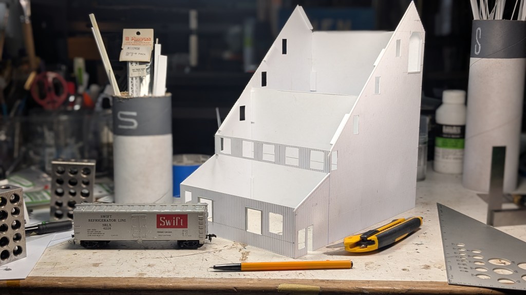 Then I kitbashed some beautiful structures that really existed in West Oakland, notably Pacific Coast Logistics, a cold storage transfer facility that gets a healthy amount of reefer traffic, even today. I was working on a plethora of structures for him and was about to paint the entire SF skyline on the other wall when I learned he’d passed away very unexpectedly from heath issues.