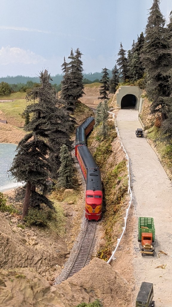 This MASSIVE 14×42′ empire fits into a tandem two-car garage in a 1940’s row home. It captures a freelance take on the Northwestern Pacific railroad in the redwood forests of Northern California in the 60’s.